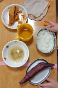 園内の給食センターにて出前授業をした後の昼食でじっくり蒸かした